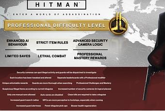 El Nivel de Dificultad Profesional llegará con una actualización el mismo día que se lanza en disco Hitman y supondrá un mayor desafío para los usuarios, ya que contará con nuevas características de juego, una forma diferente de mostrar la maestría con recompensas únicas, revisadas mecánicas de juego y nuevo comportamiento para la IA.