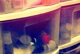 Por ahora, casi todas mis cosas están guardadas en unas cajoneras de plástico en mi vestidor, lejos de la ventana.. Estoy tratando de conseguir unas opacas para que no estén tan expuestas a la luz solar y al calor. La mayor parte de mis productos están guardados lejos del baño, para evitar que la humedad del ambiente los perjudique.