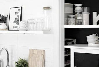El edificio fue construido en los años 60 (si veis el par de fotos al final de como estaba antes de la reforma, vais a ver enseguida la edad) y aun así Laura decidió conservar el cerramiento original de cristal, madera y ladrillo de la terraza, que pintaron de blanco y la despensa abierta original de la cocina, que el año pasado pintó en pizarra negra.