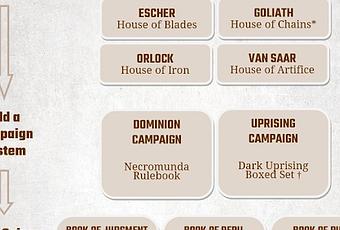 Antes de seguir adelante, si alguien tiene pensado o le interesaría empezar a jugar a Necromunda, la imagen de la cabecera de esta entrada le va a venir muy bien. Son los paso para empezar a jugar a Necromunda, que coger, los suplementos que hay, que te aportan, por donde continuar, etc.