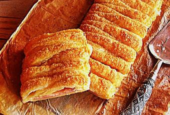 5. La última capa será de jamón cocido nuevamente.6. Cerramos el hojaldre haciendo la forma de trenza como se ve en la imagen.