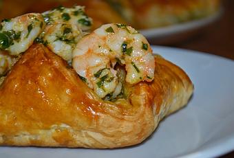INGREDIENTES500 gr de champiñones laminados 400 gr de hojaldre 2 cebollas grandes 200 ml de nata3 cucharadas de aceite de oliva1 cucharada de harinaPerejilSal y pimienta1 huevo batidoPara los langostinos500 gr de langostinos3 dientes de ajo ralladoRalladura de 1 limónPerejilSal2 Cucharadas de aceite de olivaZumo de medio limónGuindilla al gustoPROCESO