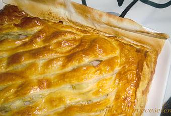 Es un pastel de hojaldre fino y muy rico si lo comemos recién sacado del horno, pero que no pierde ni un ápice si lo servimos frio, por lo que nos puede venir muy bien tanto para una comida o una cena, como para cuando tenemos una celebración con "picoteo"