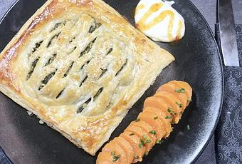 Lo que mas me gusta es lo bien que guarda la temperatura y como gusta a todos da tiempo a colocar las demás cosas que a la hora de comerlo siempre está caliente.Eso hace que el queso esté tambien en su punto de fundido.El queso que he usado es de cabra sin lactosa, me costó encontrarlo pero ya tengo mi sitio para ello.El empeño es porque da mucho sabor y esta receta con el toque dulce de las pasas lo agradece.Para el reto Cocinarte de este mes la imagen tan navideña me ha dado la idea de esta receta porque tiene una presentación apropiada y porque los colores me inspiraban a algo asi, lo mismo un asado tambien me da esos tonos pero buscaba el color ocre y pastel para el centro del plato junto al anaranjado con que lo he acompañado, en este caso un boniato baby cocido y aliñado con ajo, perejil y aceite de oliva que queda muy resultón en cuanto a sabor y color.