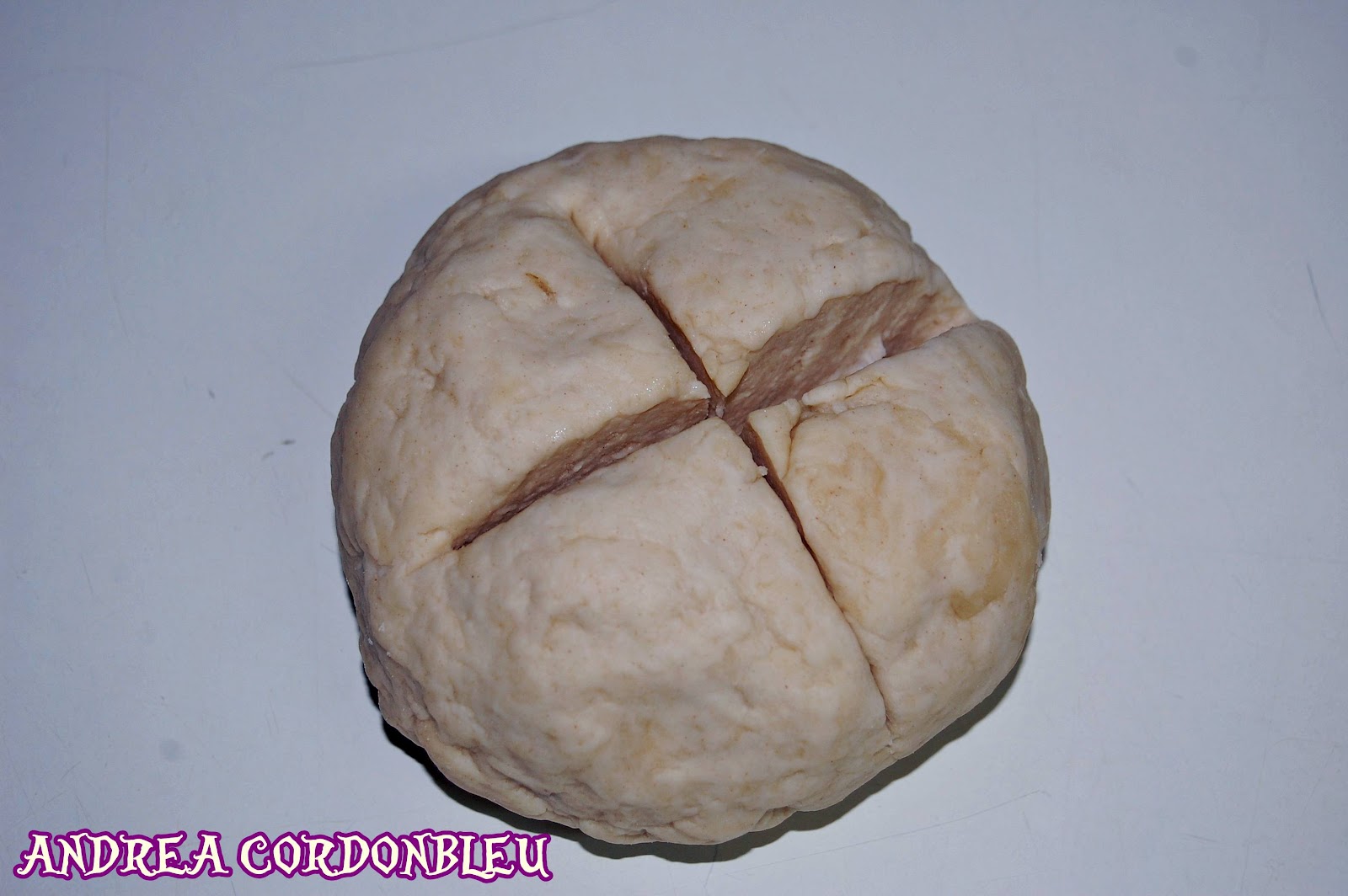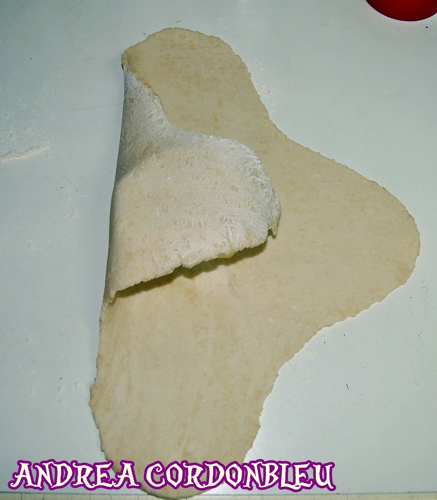 Se espolvorea la mesa con harina y se coloca la bola encima. Se dan dos cortes en forma de cruz y se deja reposar durante 20 minutos.Una vez reposada la masa, se espolvorea la mesa con harina, se coge el rodillo y, partiendo de las puntas que se han formado al dar los cortes, se estiran estas formando una estrella de cuatro puntas en cuyo centro queda la masa más abultada que en las puntas.