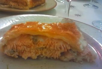 Extender la mantequilla por encima del los lomos de salmón.Cubrir con el hojaldre, envolver y cerrar, sellar doblando los bordes humedeciendo un poco con agua, y volviendo a doblar para que no se escapen los jugos. Hacer 2 o 3 agujeros centrales para que se salga el vapor de la cocción. Ver foto.Batir el huevo y pintar todo el hojaldre.Cubrir la bandeja para el horno con papel vegetal o sulfurizado de horno, y colocar el hojaldre.Introducir en el horno 20 minutos a 200ºC. hasta que se vea dorado y crujiente.Dejar reposar 5 minutos y servir seguidamente.