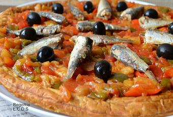 Ingredientes :Una plancha de hojaldre fresca Pisto casero Aceitunas negras Sardinillas en aceite de oliva