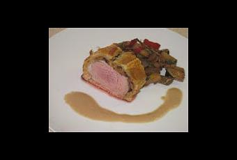 Salpimentamos el solomillo (al gusto) y lo sellamos en una sartén con un poco de aceite de oliva. Se extiende la masa de hojaldre y se colocan sobre ella, una al lado de la otra, las lonchas de bacon. Sobre esto colocamos los solomillos, untados por encima de paté o de foie. Enrollamos el hojaldre como si fuera un brazo de gitano. Batimos el huevo y pintamos con él el hojaldre. Solo queda decorar y pinchar con un tenedor el hojaldre y lo metemos al horno (previamente precalentado) a 180 ºC durante media hora.Para preparar la salsa, comenzamos pelando y cortado la chalota (o cebolla tierna) en juliana. La pochamos en una cazuela a fuego lento hasta que se vuelva transparente. Una vez esté transparente incorporamos un chorrito de vino de oporto o de brandy y dejamos que se evapore el alcohol. Seguidamente incorporamos el caldo de ave (200 ml) y la nata (100 ml). Dejamos cocinar a fuego lento durante 5 minutos. Incorporamos unos cien gramos de foie cortado en dados y lo dejamos otros 5 minutos que se cocine a fuego lento para que se funda poco a poco. Lo cambiamos a un vaso de batidora y la pasamos para que quede una salsa fina. Volvemos a ponerla en el cazo y la dejamos un par de minutos que cueza a fuego lento y se liguen bien todos los sabores. Con paté ibérico también sale genial.