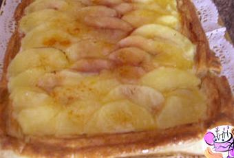 Es una tarta muyfácil de hacer; para la crema pastelera se calienta la leche con la ralladura de limón, aparte se baten las yemas con el azúcar y se mezcla con maicena.Se agrega la mezcla a la leche y se cuece poco a poco sin dejar de remover hasta que espese.Se extiende la masa de hojaldre un poco mas fina con el rodillo y se hacen varias capas en los bordes.Hay que pinchar bien la masa para que no suba en el centro, pintar con huevo batido y al horno a 170º CCuando esté dorado, llenar con crema pastelera y cubrir con la manzana, que habremos frito en mantequilla y azúcar previamente. Una vez fría, pincelar con gelatina líquida por encima de toda la tarta , quedará brillante.