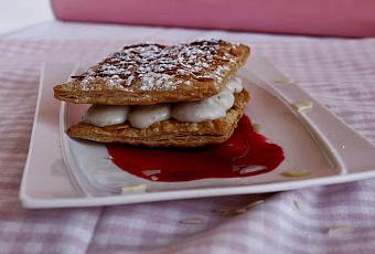 Hojaldre relleno de crema de castañas y coulis de frambuesa