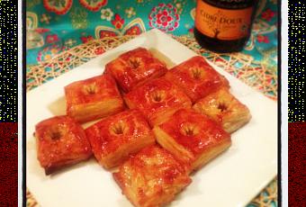Emplatamos y servimos con unos buenos chorros de caramelo por encima para que los hojaldres vayan empapándose aún más y más en el caramelo. (Fijaros que el plato está inundado de caramelo, no ahorréis en caramelo… Echadle unos buenos chorros por encima y dejad el caramelo del plato para que se empapen bien durante horas).