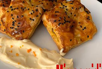 Pues yo tenía unas verduritas y un hojaldre y los aproveché para hacer estos apetitosos hojaldritos y para darle un toque de "esta es una receta Michelín" los acompañé con una mayonesa de mandarina. Oynss.. que quedé como una reina...