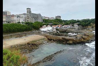 En Biarritz la cerveza más barata la hemos pagado a 3,00 €, y hay dos lugares en los que uno puede tener la sensación de que cañea, aunque sea a ese precio, el «Bar Basque», que está en un chaflán de la calle que baja al Port Vieux, y en la «Maison Pujol», que se anuncia como el «Le Comptoir du Foie Gras», al lado del mercado, de Les Halles. Se puede estar en la barra tomando la cerveza y probando alguna tapa a unas horas en las que parece que todo el mundo ya ha comido. En la zona, pero ya a la caída de la tarde, nos topamos con un mercado callejero que ocupaba mucho más que el que todos los días se instala en la explanada de la avenida de Victor Hugo, frente a la Iglesia de Saint-Joseph. Me llamó la atención el nuevo mobiliario urbano. Unos grandes cubos de hormigón sobre los que algunos viandantes descansaban y consumían algún producto comprado en los puestos. Por la mañana, por la Rue Gambetta, una máquina con pala excavadora provocaba una breve retención del tráfico al colocarlos en uno de los accesos para prevenir un atentado terrorista. Nuevos tiempos. En un café de la Rue Mazagran, una pizarra en el exterior anunciaba actuaciones de grupos musicales programadas para los próximos días. Ingenioso nombre el de uno de los grupos: «Sigmund und Kierkeggard Funkel». Es curioso cómo cambia el aspecto de una ciudad de playa cuando llueve. Cambian los colores y el olor no es el mismo; pero, sobre todo, uno se pregunta dónde se mete toda esa gente que hacía pocas horas llenaba las calles y la arena. Lo normal es pensar en que se queda en casa o va en masa a los centros comerciales; pero yo creo que son como las sombrillas y las hamacas, que, durante la noche y los días aciagos, se apilan y se apartan en algún sitio hasta que se sacan por la mañana los días con sol. Tras el paseo diario de hora y media —nos da igual que llovizne— y hechas las visitas a los lugares señalados, vivimos la ciudad en las terrazas —catorce euros todos los días en «Les Colonnes» por cuatro cañas— hasta lograr el objetivo de comer en el restaurante con mejor cara. En el Port des Pêcheurs, una muy buena comida en «Chez Albert» con excelentes pescados nos dio la prueba de que la persistencia puede llegar a ser tan efectiva como una buena reserva a tiempo. Buen ambiente.