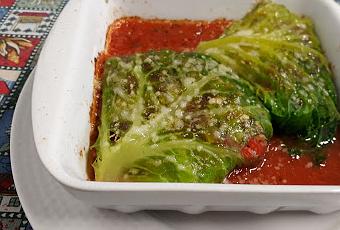 Colocamos la salsa en cada una de las cazuelas para horno, y las hojas de col rellenas. Las espolvorearemos con el queso rallado y las gratinaremos durante unos 8 minutos a 180ºC y… ¡¡¡LISTO!!!
