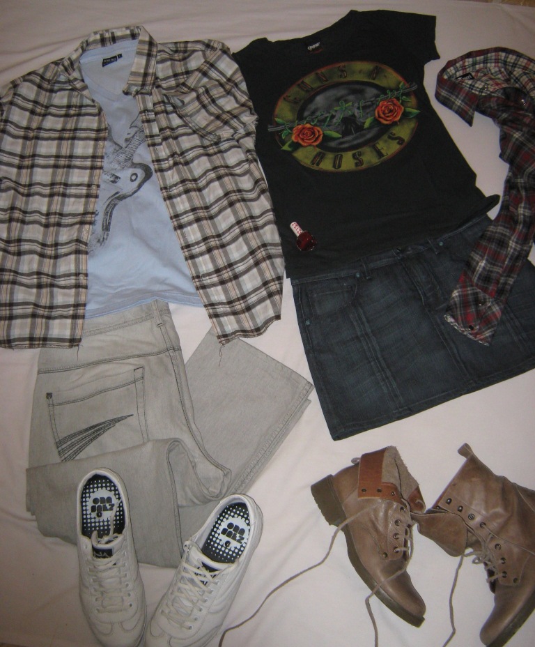 Chico: camisa alfis- remera rever pass- jean ona saez- zapatillas ona saez. Chica: remera GnR complot- mini de jean tucci- borcegos joies- esmalte chic- camisa leñadora tucci.