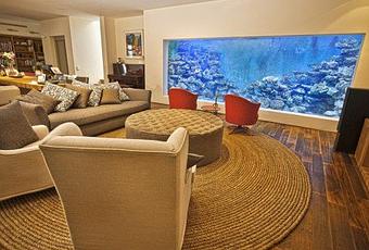 El acuario de la sala de estar de Fruchter contiene 30.000 litros de agua y es lo suficientemente grande como para que se pueda zambullir y alimentar a los peces de la palma de su mano. El tanque es el hogar de 150 peces tropicales de 30 especies diferentes, así como un arco iris de corales que constantemente se mueven hacia adelante y hacia atrás con las ondas de luz creadas por un impresionante sistema de filtración. El tanque está diseñado para replicar el entorno natural del arrecife, lo que también ha permitido a algunos de los residentes del tanque crecer a un tamaño que normalmente sólo se alcanza en la naturaleza.