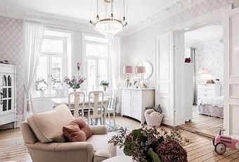 Papel pintado en las paredes, molduras talladas en los techos, carpintería y muebles decapados en blanco; lámparas de cristal, apliques tipo candil con velas, acogedoras butacas, suaves cojines de terciopelo... y una romántica paleta de colores que hacen que recorrer esta casa seacomo recorrer una preciosa casa de muñecas