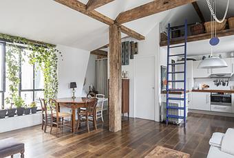 la escalera de madera con la que se accede al altillo, además de poner una nota de color en la vivienda, sirve para dar cierta independencia visual a la cocina cocina