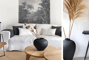 El protagonista indiscutible del salĂłn es el SofĂĄ Ibiza Linen en color blanco, una pieza que se funde con el entorno sin robar protagonismo. Se ha combinado con cojines en tonos neutros y detalles en negro, como la estructura de la escalera y los jarrones de cerĂĄmica, para un contraste equilibrado. El toque final lo ponen las cortinas de lino, que permiten el paso de la luz natural sin interrupciones.
