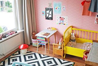 No sé si es el papel pintado de la pared del fondo, tan delicado con su color rosa, o si es su contraste con la cuna en ese amarillo rabioso, o la alegría de los banderines verbeneros que cuelgan por toda la habitación, o quizá el toque clásico de la cómoda-cambiador con encimera de mármol... o quizá, seguramente, sea la mezcla de todo. El papel pintado, el zócalo de pizarra, los muebles de madera - pintados o no -, los dibujos pegados a la pared con washi tape... un auténtico popurrí en el que, misteriosamente, todo encaja.