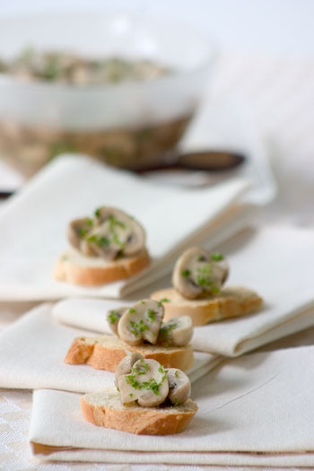 Wash the mushrooms with a damp cloth (they should not be washed under water because they will absorb the same) and cut each one in half. Chop the onions in brunoise and crush the garlic. Suffer the onions, garlic, and then the mushrooms for fifteen minutes in a cauldron with a half cup of olive oil. Let cool.Add the half cup of vinegar, salt, pepper, oregano and chopped fresh parsley. Place in a glass container and bring to the refrigerator. Leave to macerate preferably from the previous day. Serve cold accompanied by toasted pancitos, biscuits like pasapalo or entrance.