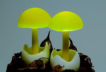 El artista japonés Yukio Takano tiene un don para recrear las delicadas propiedades de las setas con resinas teñidas iluminadas desde el interior con luces LED escondidas.