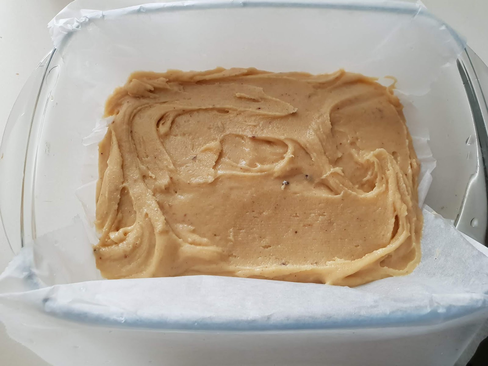 5. - Echamos sobre un molde con papel de hornear y extendemos lo más nivelado que podamos, como es muy densa la masa, se nos pegará un poco, pero si humedecéis la espátula con agua, será más fácil.