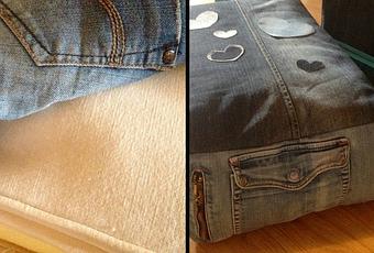 Vaqueros viejosHilo y aguja o máquina de coser (en mi caso)Cojin viejo (partido en dos y superpuesto)Vamos midiendo los cojines...(los 6 lados ) y cortamos retazos de vaquero un poco más grandes...unimos en forma de cubo y listo!!A coser!!!! Más fácil imposible!!!