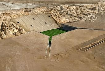 Hundido en la fresca profundidad de la arena del desierto, el estadio, como un tesoro escondido, se presenta al visitante como una serie de planos inclinados fuertemente que salen de la tierra. Estos planos emplazados en el contexto de una montaña volcánica, definen el espacio del estadio y sus actividades conexas, además de crear un magnífico lugar que permita el conglomerado de un gran número de visitantes en el corazón del vasto paisaje.