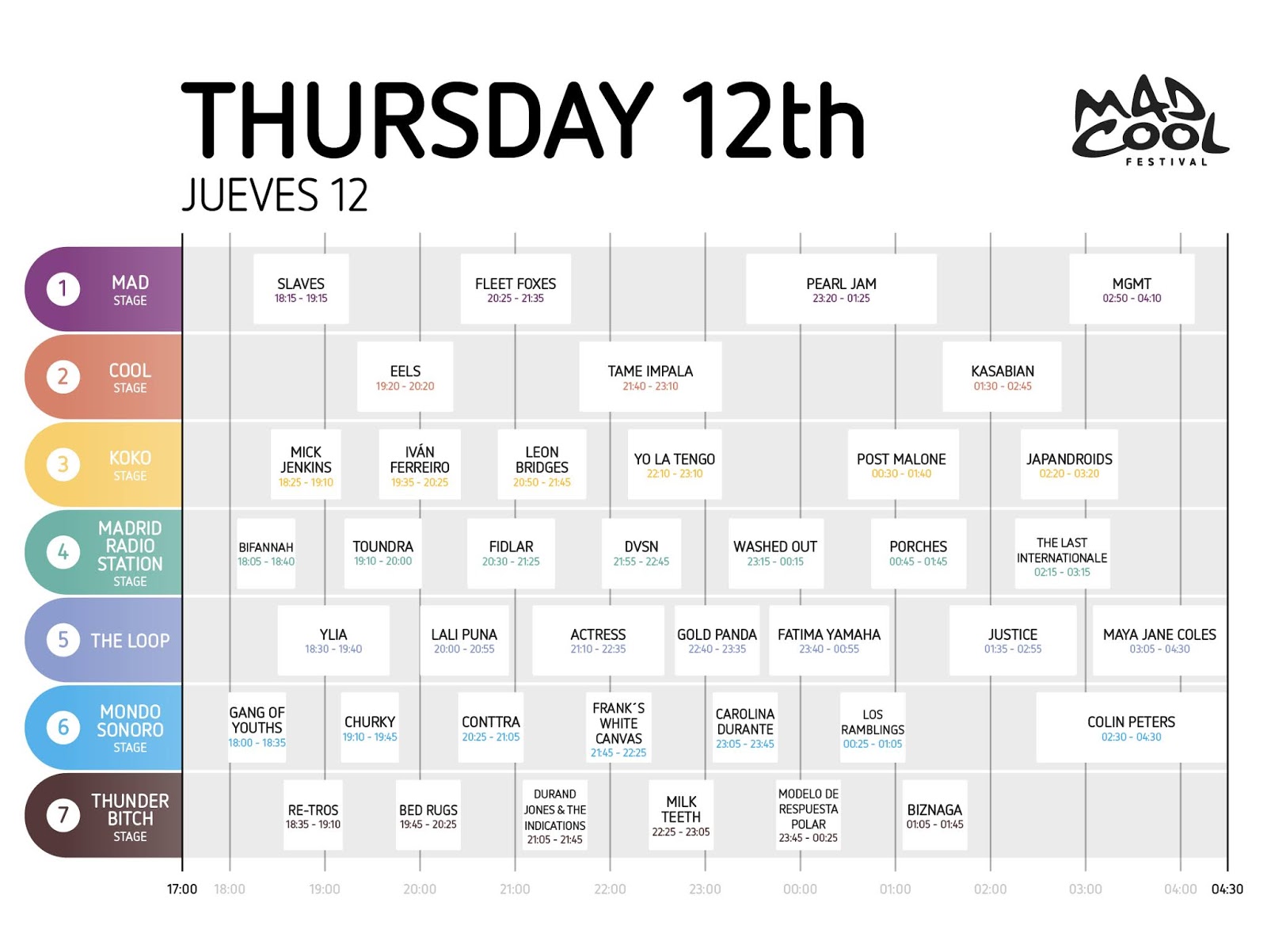 La organización confirma además la presencia de los DJs Colin Peters y Juan Sueiro, que serán los encargados de cerrar el escenario Mondo Sonoro los días 12 y 13 de julio, respectivamente. Además, debido a un cambio de última hora, la banda Repion, seleccionada a través del concurso Mad Cool Talent, pasará a actuar el sábado 13 de julio.
