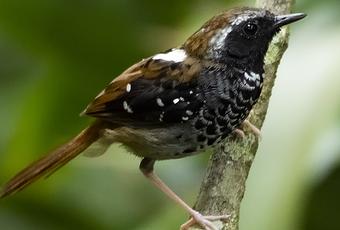 El hormiguero escamoso(Myrmoderus squamosus) u hormiguero escamado, es una especie de ave paseriforme de la familia Thamnophilidae perteneciente al género Myrmoderus. Anteriormente formaba parte del amplio género Myrmeciza, de donde fue separada recientemente, en 2013. Es endémica del sureste y sur de Brasil. Se distribuye en el sureste de Brasil, en el sur de Río de Janeiro, centro y este de São Paulo, centro y este de Paraná, este de Santa Catarina y noreste de Río Grande do Sul; fue registrado una vez en el parque nacional do Iguaçu. Esta especie es poco común en el suelo, o cerca, de bosques húmedos altos de la Mata Atlántica, desde el nivel del mar hasta los 1000 m de altitud. Permanece cerca del suelo entre la hojarasca o en grutas y lugares sombríos. Mide 14 a 15,5 cm. El plumaje de las partes superiores, la nuca y el píleo son de color castaño; presenta una mancha dorsal blanca semioculta y una línea superciliar blancuzca; la cara, el cuello, el mentón y la garganta son negros; las coberteras de las alas son negras con barras y puntos blancos; en el macho el pecho es negro escalado con puntos blancos; la hembra tiene garganta y pecho blanco escalado con puntos negros; el vientre es blancuzco y las patas rosadas blancuzcas. Se alimenta de insectos. Busca alimento entre la hojarasca, generalmente en pareja; a veces se une en bandas mixtas con otras especies y sigue a las hormigas guerreras. La especie M. squamosus fue descrita por primera vez por el ornitólogo austríaco August von Pelzeln en 1868 bajo el nombre científico Myrmeciza squamosa; localidad tipo «Mato Dentro e Ipanema, São Paulo, Brasil». El nombre genérico masculino «Myrmoderus» deriva del griego «murmos»: hormiga y «derō»: azote, garrote; significando «destruidor de hormigas»; y el nombre de la especie «squamosus», del latín: escamado. Info:www.wikipedia.org