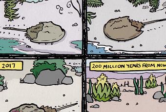 El mes pasado ya vimos por aquí otra tira de False Knees, el webcómic creado por Joshua Barkman en 2011. En esta tira publicada el pasado enero, Barkman se fija en uno de esos animales que con frecuencia recibe la etiqueta de "fósil viviente", el cangrejo herradura o cangrejo cacerola y en como a pesar de haber habitado el planeta durante millones de años, vive en la actualidad tiempos convulsos.