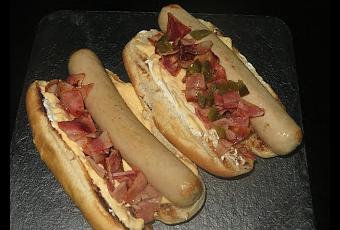 Elaboración:Tostamos el pan en una tostadora y lo untamos con queso crema. Mientras pasamos por una sartén el bacon y lo picamos. En esa misma sartén hacemos las salchichas.