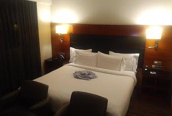 Hacia la derecha, y a los pies de la cama, encontramos una mesa redonda de centro en cristal negro sobre la que está el mando a distancia de la televisión. A cada lado sendas butacas de piel en tono verdoso. Justo detrás queda la enorme cama. Blanca, con gran colchón muy cómodo y cubierta con un suave nórdico y agradable lencería. Cuatro almohadas también blancas con un ribete negro a cada lado. Todo el conjunto se encuentra empotrado contra un cabecero de madera de lado a lado de la pared. Sobre la cama hay otro cabecero en terciopelo oscuro. A cada lado de la cama sendas mesillas reducidas a una mera balda que imita el mármol negro. Sobre una de ellas el teléfono y sobre otra un bloc de notas y un bolígrafo. Sobre ambas, enchufes disponibles y sendas lámparas metálicas con tulipas en blanco. En cada una de ellas además hay un brazo dirigible con un foco para la lectura en la cama. El juego de luces es bastante cálido aunque quizá falte algo más de iluminación en la zona del maletero.