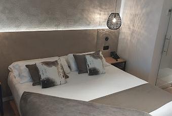 En la pared de la derecha encontramos el display del aire acondicionado: digital, con un botón de encendido y apagado, una rueda para seleccionar la temperatura y varios botones para la potencia. Funciona perfectamente y de forma exquisitamente silenciosa. Y al lado, la cama. Grande, blanca. Con un colchón de generosísimo calibre, bastante blando, sobre un canapé de piel blanca. Empotrada en un cabecero de tela marrón verdosa. Vestida con suaves sábanas blancas y un ligero nórdico. Sobre ella cuatro almohadas y cuatro cojines, algo horteras en tonos marrones. A los pies un plaid y una manta decorativa a juego. Muy limpios. A cada lado sendas mesillas, igual que el resto del mobiliario, en metal negro y madera natural. Sobre una de ellas un teléfono moderno y sobre la otra el mando de la televisión. Por encima del cabecero una tira de led da un toque cálido a la luz de la habitación. Desde el techo y hasta las mesillas cuelgan sendos apliques de mimbre oscuro que ofrecen un bonito efecto lumínico. En el cabecero y sobre las mesillas sendos potentes reflectores para la luz de trabajo, enchufes, y un interruptor con cuatro posiciones de luz para crear distintos ambientes. Por encima del cabecero y hasta el techo, la pared aparecer recubierta de un papel pintado rugoso con motivos geométricos.
