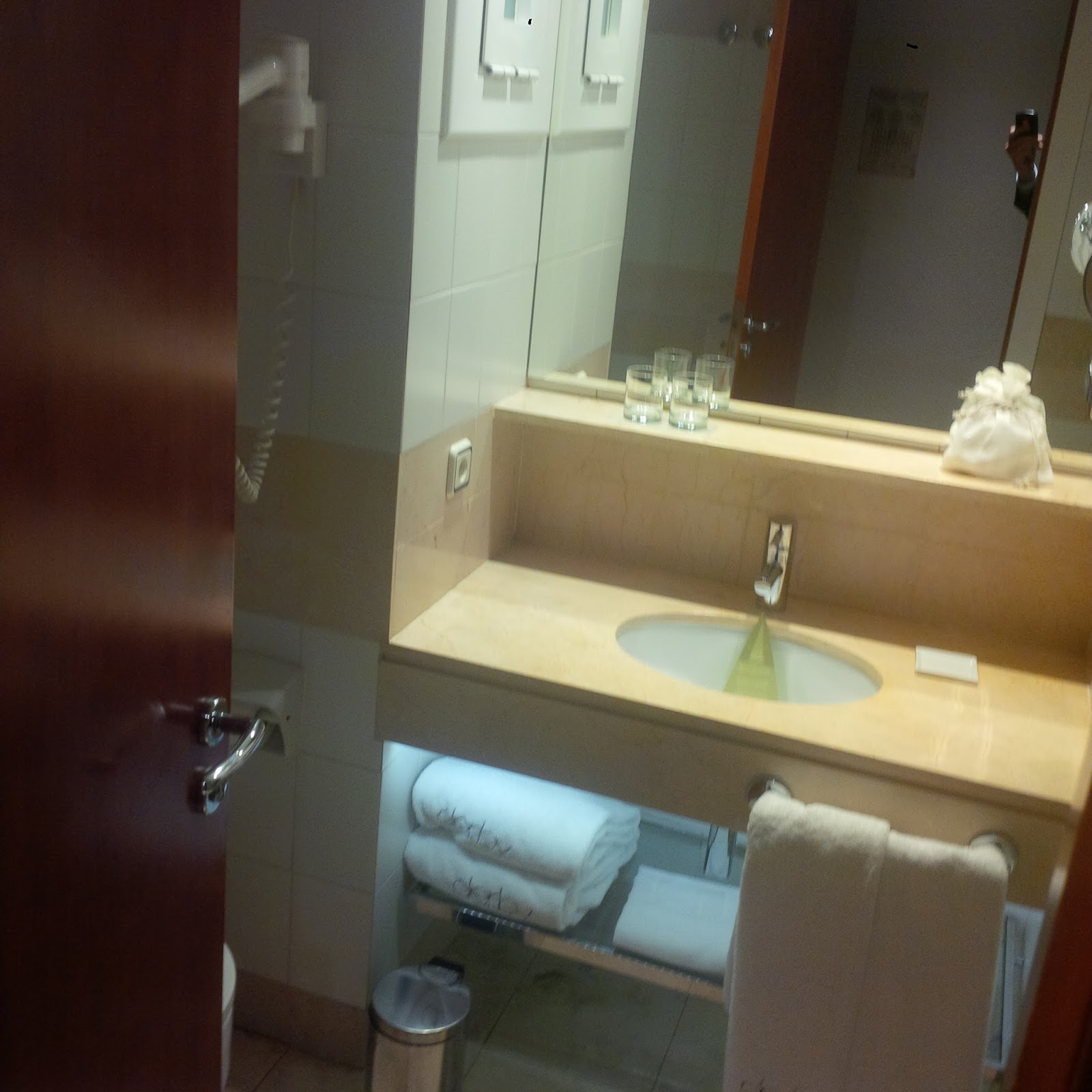 La grifería es moderna, y muy limpia. A cada lado del lavabo hay un secador de escasa potencia y un espejo de aumento. Bajo la encimera hay una estantería de cristal iluminada -lo que da una agradable sensación en la estancia- en la que se ofrecen dos gigantescas, mullidas y novísimas toallas de baño, dos de lavabo y una alfombrilla de baño.