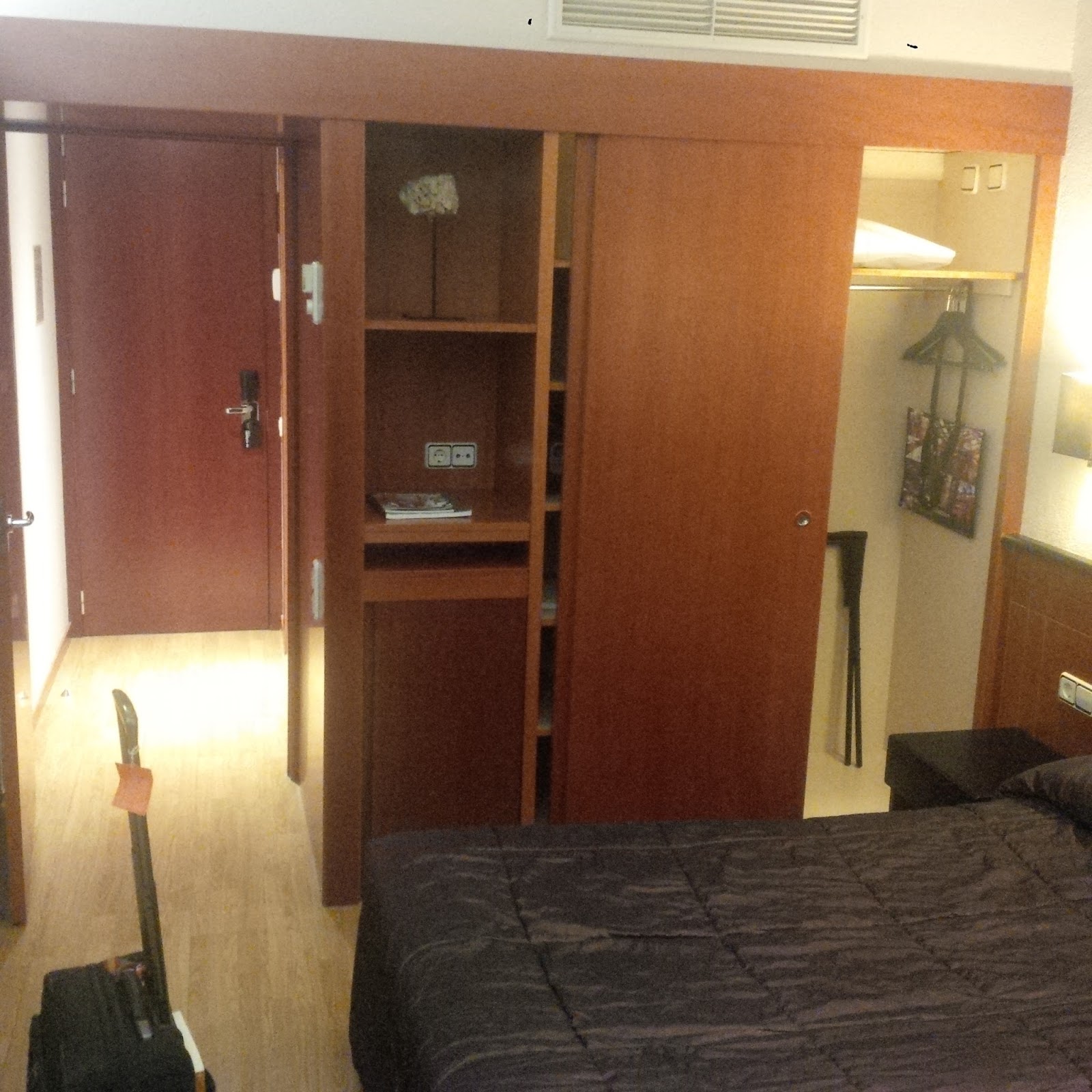 Tras la puerta la sensación cambia. Paredes de gotelé blanco, suelos de agradable y cuidada madera clara. De primeras, un pasillo con la puerta del baño, de madera rojiza y moderno pomo plateado, a la izquierda. Unos pasos más adelante y tras otra puerta, el dormitorio. La insonorización exterior es formidable, ayudada por la persiana que protege la ventana y porque el patio interior al que da el hotel es tranquilo. Sin embargo y pese a esa doble puerta, la insonorización interior es muy mejorable. Se escuchan los portazos de las puertas de otras habitaciones, las voces de otros huéspedes, pasos, duchas, despertadores...