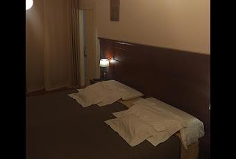 La cama es enorme. En realidad son dos camas de 110 vestidas como si sólo fuera una. Los colchones son cómodos. Las sábanas blancas, frescas y limpias. Sobre ellas una manta marrón y una colcha en tono gris verdoso brillante algo sucia. Tres almohadas de distinto tamaño y dureza ayudan a elegir el mejor descanso. La cama está empotrada contra un poderoso cabecero de madera oscura algo trabajada. A cada lado pequeñas mesillas con cajón (en uno de ellos, unos papeles de un huésped anterior) y sobre ellas pequeñas lámparas de noche con pie metálico imitando un tallo y pantalla gris metálica. La luz del techo es fría, y aunque la de las lamparitas podría dar más calor a la estancia resulta bastante insuficiente. Sobre una de ellas, un gran y moderno teléfono. No hay enchufes para el móvil sobre las mesillas, por lo que tenemos que desenchufar la lámpara para cargarlo. La insonorización interior no es excelente y, aunque el hotel es sumamente tranquilo, se escuchan pasos y voces de huéspedes cercanos.