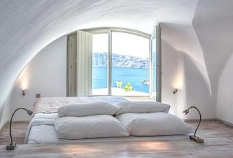 El hotel responde a la caracteristica de los hoteles de Oia, es decir construido en desniveles y balconeos al mar, donde se ubican los sectores de piscina y de ocio.