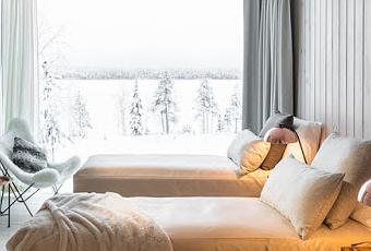 Es un hotel de arbol, con mucha superficie vidriada que permite disfrutar de la naturaleza y el entorno artico.