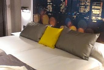Tras este curioso aseo, entramos en el dormitorio: dos camas de 90, vestidas con agradables sábanas blancas y con dos pies de cama en color gris, dos almohadas por cama y varios cojines grises y amarillos. Sobre las camas una enorme foto del atardecer en Munich (el nombre de la habitación que nos ha correspondido). A ambos lados sendas mesillas con lámparas de noche y de lectura. Sobre una de ellas hay un reloj despertador. En la otra un bolígrafo y un block de notas. En ambas hay enchufes disponibles así como interruptores, que no terminan de apagar todas las luces, ya que funciona de manera independiente una pequeña lámpara de pie situada a los pies de la cama junto a un sofá y a la enorme ventana con vistas al Tibidabo.