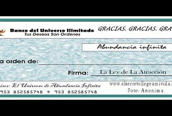 ::Imprimir este Cheque que os pongo o uno parecido, si no tenéis impresora se puede hacer a mano, o sea dibujarlo tu mism@.::Pondrás tu nombre o el de aquella persona por quien lo haces en la línea "A la orden de:":Para no entrar en el libre albedrío de la otra persona, no pedirás nada para ella en concreto cuando lo realices.::Como es un acto de FE y CONFIANZA tampoco vas a pedir nada para ti, ni dinero, ni salud, ni amor, nada.::Se trata de agradecer sin más, de confiar en que sea lo que sea que llegue será lo mejor.::Una vez puesto el nombre, no se pone nada más.::Guarda el Cheque donde sientas más oportuno.a) En tu caja de Deseosb) En tu mesilla de nochec) En la comoda o closetd) donde te parezca...