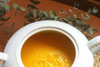 - Sofreir el puerro y la cebolla, añadirle la zanahoria a ruedas, la calabaza a cuadraditos y el caldo hasta cubrir los ingredientes. En unos 20 minutos estará listo (cuando puedas partir la calabaza con un tenedor). Lo pasas por la batidora, sal y pimienta al gusto.