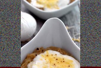 Escalfar los huevos en la sartén en agua con vinagre. Colocar en el fondo de los platos una capa de cebollas caramelizadas, disponer encima los huevos, bañar con un poco de besamel, espolvorear con queso rallado y gratinar en el horno o con el soplete (solo para que el queso se derrita). Servir calientes
