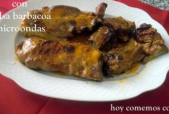 Preparación: mezclar todos los ingredientes del adobo en la batidora, poner en un recipiente la costilla y cubrirlo con el adobo. Dejar marinar unas horas. Colocar en una bolsa de hornear con la mitad del marinado, cerrarla y hacer unos agujeros con un palillo. Colocar en una fuente apta para micro y hornear 18 mintos max potencia, dando la vuelta a la bolsa dos o tres veces. Yo el ultimo golpe se lo he dado en el grill del horno porque es mas rapido