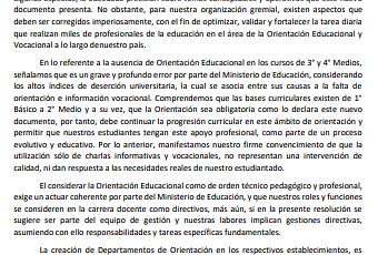 Definitivamente nos sumamos a lo expuesto en este documento, si bien se genera una necesaria actualización de la Circular N° 600 de 1991 y se precisan algunos temas de la Orientación y del rol y función del Orientador, también se deja expuesto una variedad de aspectos pendientes o que no quedan necesariamente claras, lo que conlleva urgentemente a modificar por el bienestar de esta especialidad.
