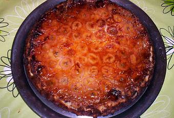 Untar un molde de horno redondo con caramelo líquido de forma que cubra todo el fondo del molde con una fina capa, y colocar los plátanos cortados en rodajas cubriendo todo el molde.