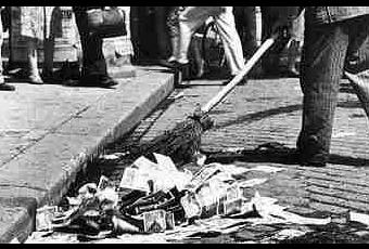 Así sucedió, sin dudas, cuando los alemanes tuvieron su primera experiencia con la inflación en los años veinte. En el año 1920 prácticamente nadie comprendió lo que supondría el tratado de paz de Versalles para la situación financiera de Alemania y su divisa. Cuando estalló la Primera Guerra Mundial había en circulación billetes por valor de 2.700 millones de marcos. A finales de 1918 aumentaron hasta los 27.000 millones de marcos y dos años después llegaron ya los 77.000 millones. En este punto el marco ya había perdido el 90% del valor que tenía en 1914. Sin embargo, la hiperinflación no comenzó hasta un año después. Al final, un dólar llego a costar 4,2 billones de marcos. En su libro “Cuando muere el dinero” (When Money Dies), el historiador Adam Fergusson describe de forma espectacular el transcurso de la hiperinflación y la ignorancia de los políticos y de la población.