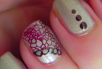 La motivación para esta manicura fue doble: Utilizar un par de tonos muy bonitos que me parecen a la vez apetecibles para esta época y retomar mis placas de MoYou London, que las tenía algo abandonadas ante otras técnicas. En este caso, vemos el precioso esmalte con micro purpurina de Essence llamado "Irreplaceable" (50) combinado en una estampación con el granate de Essie tono "Wicked" (59). Además, En anular e índice usé como base otro tono que combina genial con el de Essence, el de Belle llamado "Moon Shadow". La técnica es sencilla: estámpé un motivo floral en anular e índice de manera al bies y con el esmalte granate marqué puntitos que luego rellené con el esmalte de glitter. Mucho más sencillo que explicado con palabras...lo tienen en las imágenes.