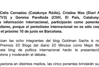 Esta tarde en Barcelona, en el auditorio de la sede de Balmes de la Universitat Pompeu Fabra habrá un debate que organizamos sobre Mujeres y Periodismo internacional. Cinco grandes periodistas: Celia Cernadas, Cristina Mas, Isabel Galí, Gemma Parellada y Silvia Heras nos muestran cómo es la cobertura internacional para las mujeres.